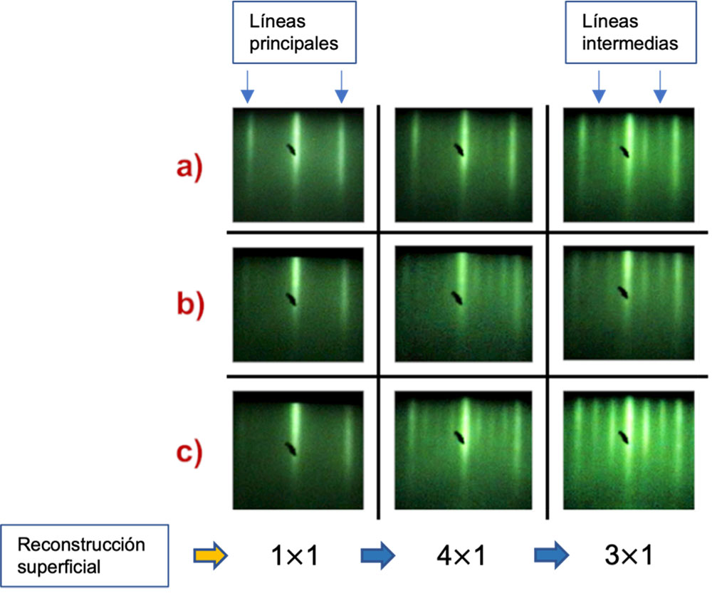 La técnica de MBE permite estudiar cómo el Mn afecta el crecimiento de AlN sobre silicio. Dependiendo de la temperatura y del flujo de Mn, se observan cambios en la superficie del material y en el modo de crecimiento. Los átomos de Mn se reordenan en la superficie cuando el crecimiento se detiene temporalmente, lo que sugiere que este elemento cambia el comportamiento superficial, actuando como surfactante. Una técnica muy útil para estudiar cómo cambian las superficies de materiales cristalinos es la reflexión de electrones de alta energía por difracción, conocida por sus siglas en inglés como RHEED. En esta técnica, un haz de electrones se dirige casi de manera paralela a la superficie del material. Al chocar con ella, los electrones se dispersan y generan un patrón que revela cómo están organizados los átomos en la superficie. RHEED se usa habitualmente para observar los materiales mientras se están formando, lo que permite entender y controlar su crecimiento cristalino. En la Figura 1 mostramos los cambios en los patrones de difracción RHEED del AlN con diferentes flujos de Mn. El cambio en la simetría de los patrones RHEED indica un cambio en la organización de los átomos de la superficie.