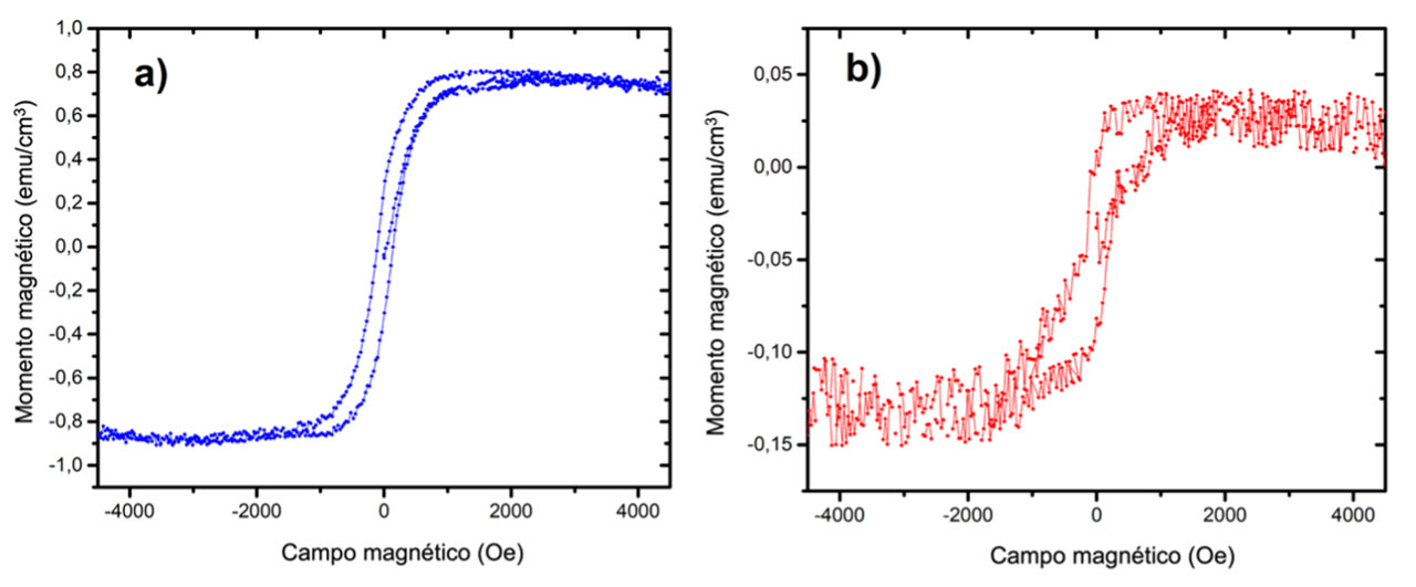 La respuesta magnética de las muestras se evaluó mediante la caracterización por magnetometría de muestra vibrante (VSM). Solo la muestra crecida a baja temperatura presentó una señal ferromagnética clara, con una curva de histéresis definida (Figura 2). La muestra crecida a más alta temperatura no ha mostrado señales ferromagnéticas detectables. Este resultado refuerza la idea de que, bajo condiciones adecuadas, el Mn puede incorporarse en sitios del cristal que favorecen el ferromagnetismo, mientras que en otras condiciones el Mn permanece en la superficie.
