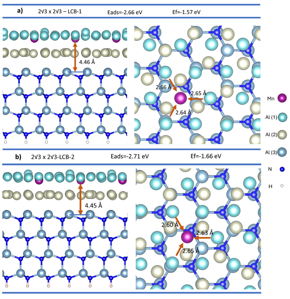 Para comprender estos fenómenos desde un punto de vista atómico, se realizaron simulaciones computacionales usando la teoría DFT. Estas simulaciones permiten calcular con precisión cómo se comportan los átomos en una superficie dada. En particular, se modeló la adsorción del Mn en la superficie de AlN (Figura 3) y se evaluaron las energías de formación superficial bajo diferentes condiciones químicas. Se encontró que el Mn tiende a permanecer en las capas más externas del material, especialmente a altas temperaturas, y que la difusión hacia el interior es poco probable a altas temperaturas. Además, los cálculos permitieron explicar por qué ocurren ciertas reconstrucciones superficiales cuando el crecimiento se interrumpe, y cómo la presencia del Mn favorece transiciones entre distintas configuraciones atómicas. Estas simulaciones, por lo tanto, respaldan los resultados experimentales y ofrecen una comprensión más profunda de los procesos que ocurren durante el crecimiento.