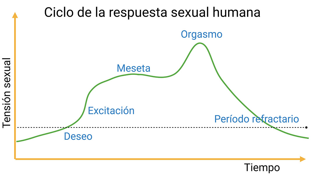 La función sexual normal en humanos es resultado de una interacción compleja y balanceada entre los sistemas nervioso, circulatorio y hormonal con la mente para producir la respuesta sexual. La respuesta sexual humana, así como la de las otras especies de mamíferos, se define a través de un ciclo de eventos y conductas que pueden dar lugar a la reproducción. La primera fase del ciclo de la respuesta sexual humana (Fig.1) implica la generación del deseo, que depende de estímulos sensoriales (ver glosario para términos en cursivas), principalmente visuales, olfativos y táctiles y de señales internas aprendidas. El deseo da paso a la fase de excitación en la que se presentan cambios físicos que incluyen aumento en la presión arterial, en la frecuencia cardiaca y respiratoria, en la tensión muscular y hay enrojecimiento de la piel. Durante esta fase aumenta el flujo de sangre a los genitales, lo que promueve la lubricación vaginal en mujeres y la erección del pene en los varones. La excitación aumenta durante la estimulación genital, llega a una meseta durante la consumación de la interacción sexual y alcanza su pico durante el orgasmo. En éste aparecen contracciones musculares rítmicas, hay liberación de la tensión sexual y se experimenta un placer intenso.
