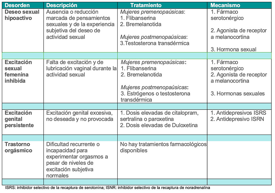 De acuerdo con la Sociedad Internacional para el Estudio de la Salud Sexual de las Mujeres, el DSH se define en las mujeres como la ausencia de motivación por la actividad sexual o la ausencia de deseo de iniciar o participar en la actividad sexual que se acompaña de distrés personal clínicamente significativo y no se asocia necesariamente con alguna patología, aunque su prevalencia sí aumenta con la caída en los niveles de hormonas sexuales que caracteriza a la menopausia. Por ello, los tratamientos farmacológicos disponibles se dividen en los destinados a mujeres premenopaúsicas y aquellos diseñados para mujeres postmenopaúsicas. Antes de la menopausia, se utilizan la flibanserina y la bremelanotida. La flibanserina aumenta de forma indirecta los neurotransmisores dopamina y noradrenalina que estimulan el deseo sexual y la excitación; produce una mejoría moderada de los síntomas, pero tiene un índice elevado de efectos adversos.