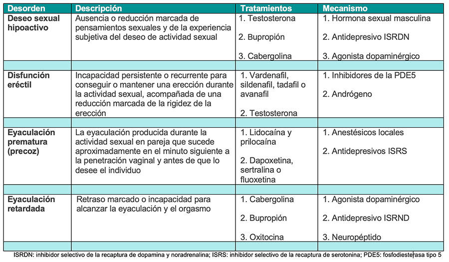 En este artículo presentamos las disfunciones sexuales descritas en hombres y mujeres, las opciones terapéuticas disponibles y los diferentes tratamientos farmacológicos para cada sexo. En la tabla 1 se describen las disfunciones sexuales de varones y en la tabla 2 aquellas descritas en mujeres.
