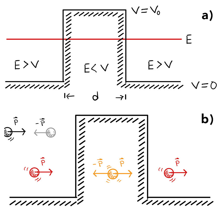 Las limitaciones impuestas por la combinación de energías cinética y potencial, define regiones clásicamente prohibidas en Mecánica Clásica. Por ejemplo, supongamos que el potencial tiene la forma de una barrera de ancho d y altura V0 (Figura 1). Fuera de la región espacial delimitada por d la energía potencial es igual a cero, por lo que la partícula se mueve libremente con energía cinética T=P2/2m. Para energías E>V0, la partícula puede estar incluso en la región d. No obstante, dicha región está prohibida si la partícula tiene energía E<V0. En este caso, la partícula cambiará la dirección de su movimiento tan pronto se tropiece con la barrera de potencial, por lo que estará confinada a moverse exclusivamente en una región concreta de la recta. Por ejemplo, si su movimiento hacia el potencial es de izquierda a derecha, la partícula será “rebotada” a la izquierda y se verá impedida de ocupar la región que se encuentra a la derecha de la barrera.