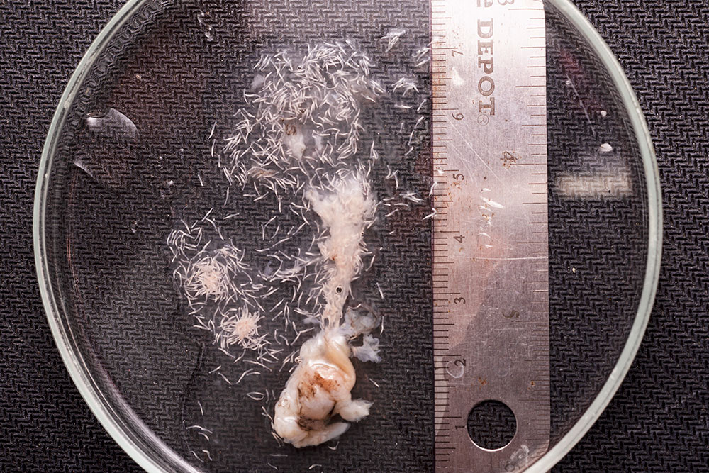 Recientemente, el Laboratorio de Patología Acuática del Cinvestav Mérida, descubrió que el cestodo Prochristianella sp. 1 que infecta al pulpo O. maya, ocasiona alteraciones en el tejido muscular de la masa bucal de este molusco. Este es el primer reporte de una patología identificada en cefalópodos causada por un helminto (Figura 2).