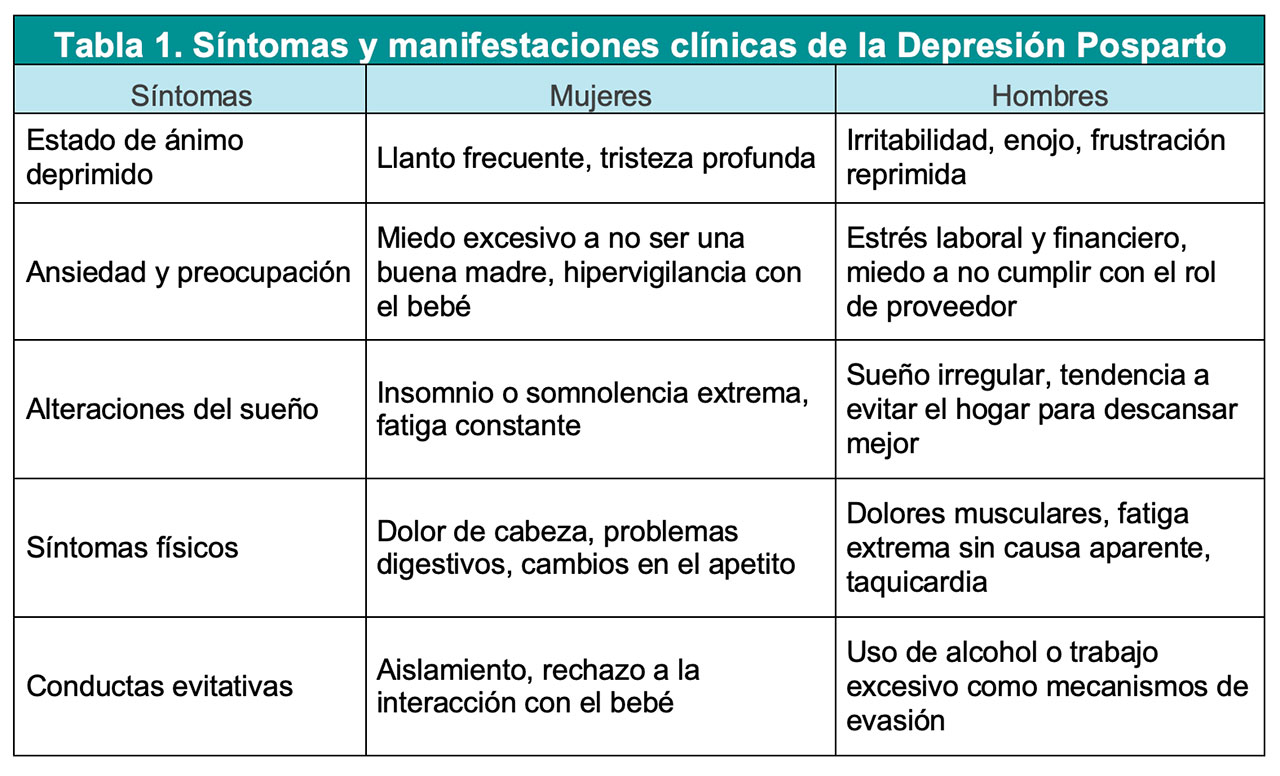 La tabla 1 compara los síntomas de la depresión posparto que presentan tanto las mujeres como los hombres. En resumen, se puede ver que los síntomas clásicos más visibles en mujeres son el llanto y la tristeza profunda, mientras que los hombres tienden a manifestar la depresión con agresividad, irritabilidad o a través de conductas de escape (trabajo, alcohol, aislamiento), lo que dificulta su diagnóstico.