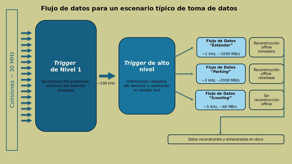 La asombrosa tasa de colisiones del LHC, combinada con el volumen inmenso de datos necesarios para desentrañar interacciones complejas, plantea un desafío fundamental para los experimentos. Los sistemas de trigger, adquisición de datos y procesamiento posterior tienen recursos limitados que deben distribuirse cuidadosamente entre los diferentes objetivos de investigación. Entonces, ¿cómo podemos guardar más colisiones si ya estamos en el límite? La respuesta está en reflexionar creativamente sobre por qué se guarda tan poco. Los principales obstáculos son dos: primero, cada colisión genera tanta información que es imposible procesarla toda rápidamente; segundo, no es viable desplegar la capacidad de almacenamiento necesaria para guardar una mayor cantidad de colisiones. Para enfrentar estos retos, se han desarrollado soluciones ingeniosas conocidas como ‘parking’ y ‘scouting’, tal como se ilustra en la Figura 2.